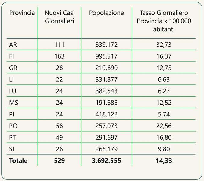 La Toscana si trova al 13° posto in Italia come numerosità di casi (comprensivi di residenti e non residenti), con circa 6.427 casi per 100.000 abitanti (media italiana circa 6.985 per 100.000, dato di ieri). Le province di notifica con il tasso più alto sono Prato con 8.455 casi per 100.000 abitanti, Pistoia con 7.635, Pisa con 6.879, la più bassa Grosseto con 3.860.