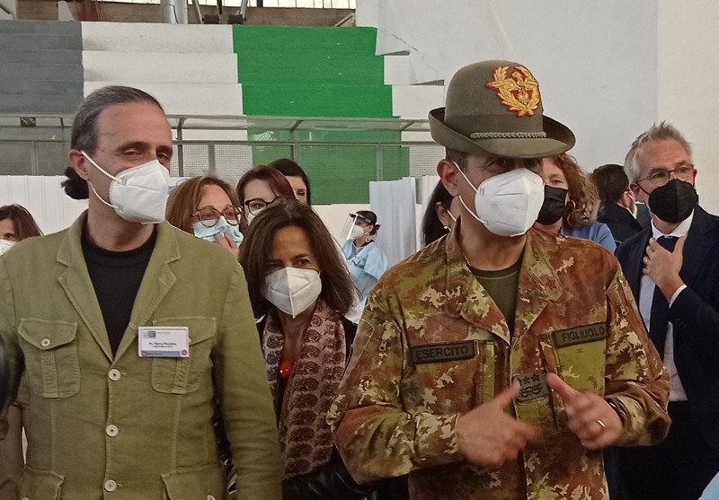 “L’Italia che fa squadra vince e qui oggi ho visto lavorare la squadra Italia, con la capacità di mettere insieme associazionismo, Protezione civile, Forze armate, Regione, Asl, medici anche in pensione o giovani reclutati per questa attività, infermieri, personale amministrativo. Ho visto la capacità di fare squadra e questo è vincente”. Così il generale Francesco Paolo Figliuolo, commissario straordinario per l’attuazione e il coordinamento delle misure di contenimento e contrasto dell’emergenza epidemiologica Covid-19 e per l’esecuzione della campagna vaccinale nazionale, al termine della visita al PalaGiannelli, hub principale della campagna vaccinale per la provincia di Siena.