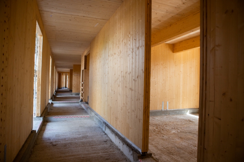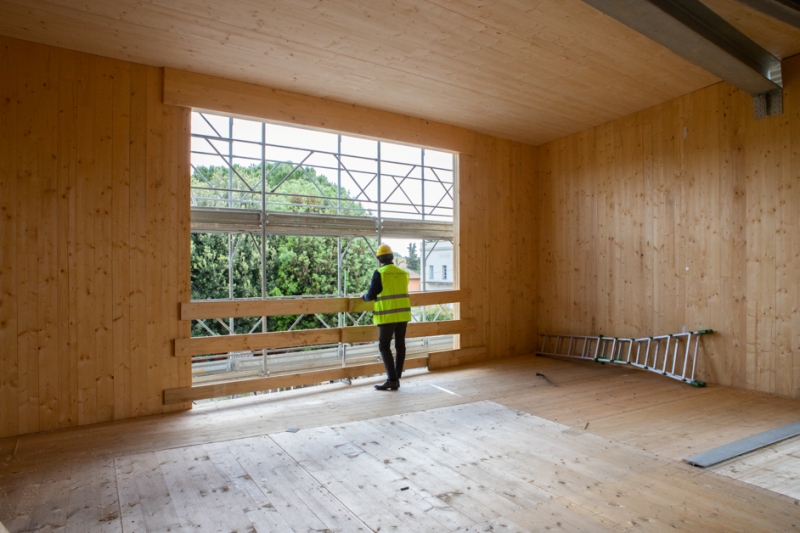 L'edificio ha una struttura con pannelli portanti e solai a lastra in X-lam mentre l'agorà che rappresenta l'ingresso della scuola ha una struttura formata da pilastri e travi in lamellare lasciate a vista per caratterizzare questo ampio volume.
