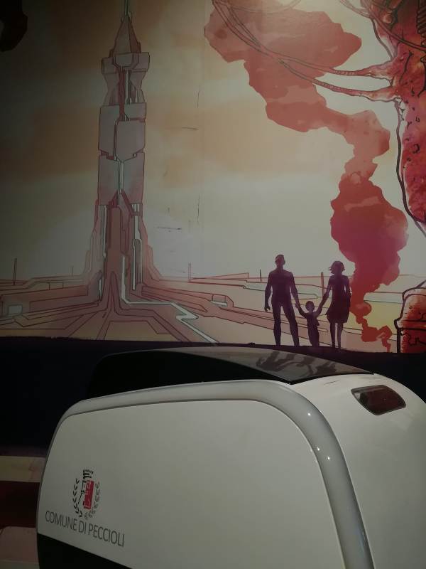 I due elementi di maggiore impatto del “Laboratorio Peccioli”, infatti, sono la discarica da un lato, con un video nel quale scorrono, anche live, le immagini del sito in movimento, e la torre campanaria, i cui lavori sono iniziati nel 1885, dall’altra. «Questi elementi finiscono per contaminare l’intero padiglione – spiega Nico Panizzi, coordinatore dello spazio dedicato alla comunità pecciolese a Venezia -. Un esempio sono i disegni e le grafiche di Riccardo Burchielli, fumettista di fama internazionale, le cui opere ricorrono in tutto il padiglione. Ma gli stessi rifiuti della discarica, in altre sezioni, vengono trasformati in elementi architettonici per gli edifici nei quali vivremo in un futuro prossimo».