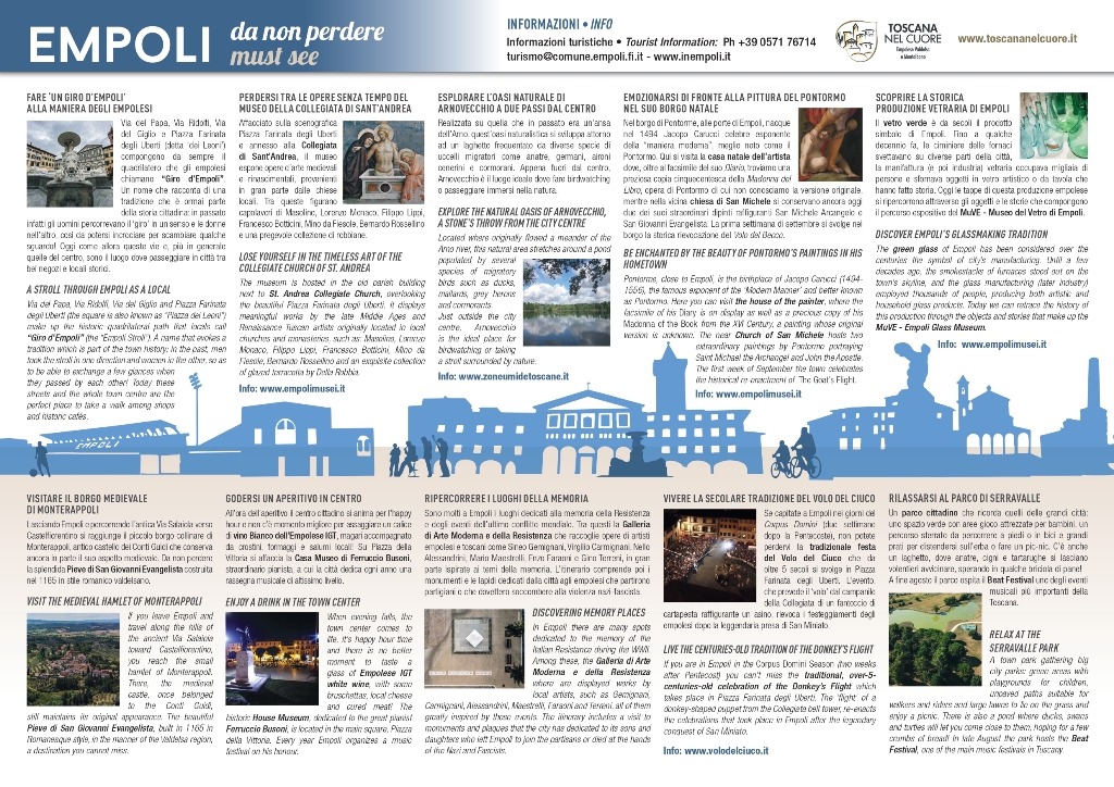 Pensata come uno strumento al servizio dei turisti e degli ospiti delle strutture ricettive del territorio, la nuova cartina turistica di Empoli è un vero e proprio invito a scoprire e a ‘vivere’ la città e i suoi dintorni.