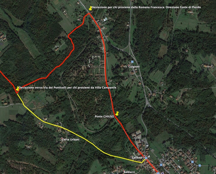 I pellegrini che percorrono quel tratto di selciato storico nel comune di Castelfranco di Sotto, dovranno quindi effettuare una breve deviazione: il percorso alternativo coincide con Via Ponticelli che si può prendere dal bivio con la Via vicinale dei Bini.