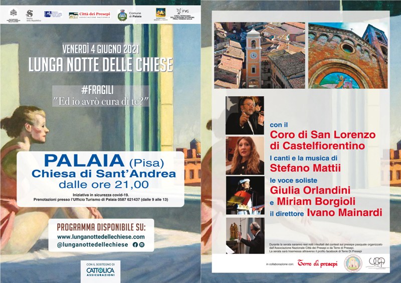 L'appuntamento è per venerdì 4 giugno alle ore 21. L'iniziativa è promossa ed stata resa possibile grazie alla collaborazione tra Associazione Nazionale Città dei Presepi, Comune di Palaia, Parrocchia di San Martino, Ucai (Unione Cattolica Artisti Italiani) e Terre di Presepi. Per quanto riguarda la proposta artistica, sarà il coro di San Lorenzo di Castelfiorentino ad esibirsi attraverso i canti e le musiche di Stefano Mattii, le voci soliste di Giulia Orlandini e Miriam Borgioli e alcuni membri del coro, sotto la direzione del maestro Ivano Mainardi. Stefano Mattii ha recentemente inciso l'inno di Terre di Presepi "Oggi è nato per voi" e "Ave o piena di grazia" ambientando i video dei suoi componimenti al museo di Castelfiorentino Benozzo Gozzoli.