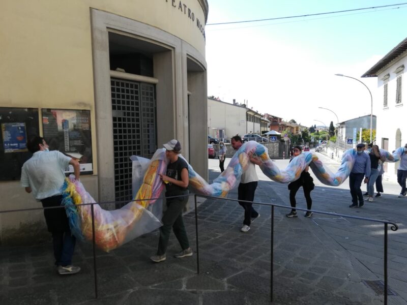 Sulla torre del Teatro Niccolini, calata dal punto più alto dell’edificio, da ieri scivola e si mostra in tutta la sua poetica bellezza la treccia della fantasia. Un segno della dimensione fiabesca, un omaggio alla letteratura che ha nutrito i sogni dell’infanzia, un oggetto che evoca storie di principesse prigioniere e cavalieri arditi, ancestrali schermaglie tra chi ostacola l’amore e chi va incontro al destino per liberarlo. Ognuno, osservando il progetto artistico che si è materializzato nell’opera d’arte contemporanea di Matteo Nasini, può vedere ciò che più desidera.