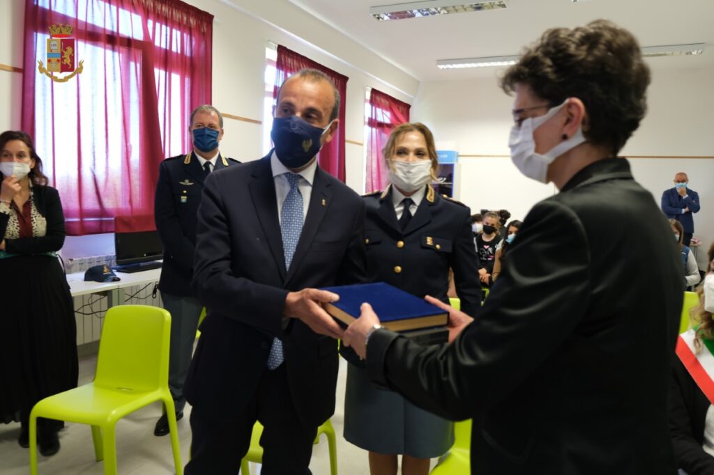 Il Questore ha consegnato al dirigente scolastico i premi inviati dal Capo della Polizia prefetto Lamberto Giannini: un tablet, una targa ricordo, numerosi gadget istituzionali tra cui cappellini quaderni ed album da disegno con il logo istituzionale della Polizia di Stato.