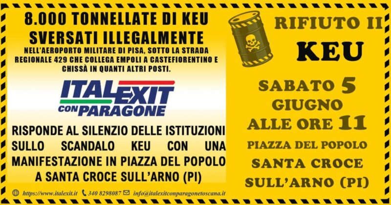 Il Coordinamento Regionale toscano di Italexit con Paragone ha organizzato sabato 5 giugno 2021 alle ore 11:00, in Piazza del Popolo a Santa Croce sull’Arno (PI), davanti al Municipio, una manifestazione contro il silenzio delle istituzioni sullo scandalo del Keu (il fango di scarto derivato dalle lavorazioni conciarie). Come risulta dalle indagini della Magistratura circa 8.000 tonnellate di questa sostanza tossica è stata ‘smaltita’ illegalmente in posti come l’Aeroporto militare di Pisa o sotto la strada regionale 429, con il concreto rischio di inquinare le falde acquifere.