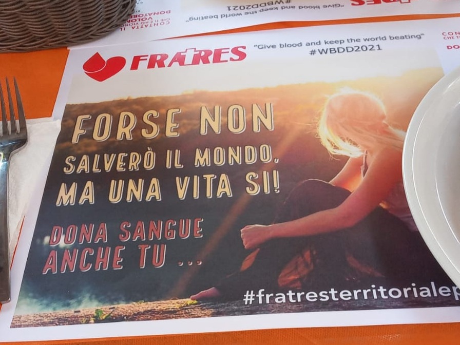 Ecco perché, dopo l’iniziativa delle buste di pane, si è deciso di arrivare di nuovo sulla tavola dei potenziali donatori: forse non salverò il mondo, ma una vita sì. Dona sangue anche tu. Così recita lo slogan che da sabato 12 sarà diffuso grazie a migliaia di tovagliette portate alle sessanta pizzerie che hanno aderito all’iniziativa, e che ringraziamo vivamente.
