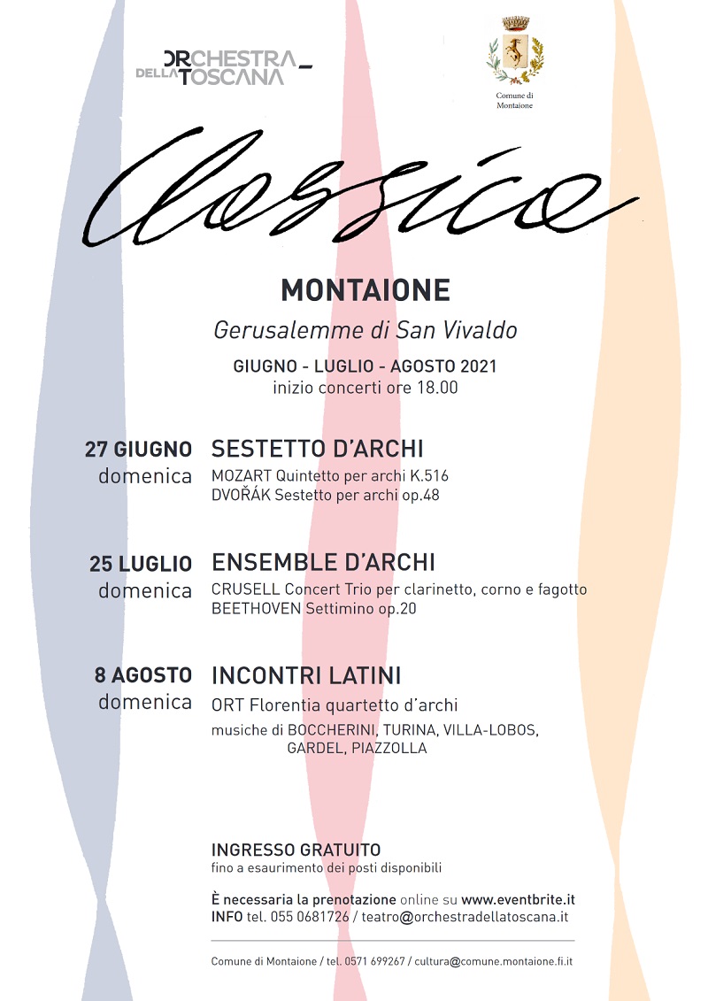 Torna nei comuni di Montaione e Gambassi Terme l’appuntamento musicale estivo “Classica”, organizzato dalla Fondazione ORT in collaborazione con le amministrazioni locali. A partire da Domenica 27 Giugno nella splendida cornice della Gerusalemme di San Vivaldo avrà inizio a Montaione la rassegna di concerti, con il Sestetto d'archi capitanato da Daniele Giorgi con un programma di repertorio tra il Quintetto K.516 di Mozart e il Sestetto op.48 di Antonín Dvořák.
