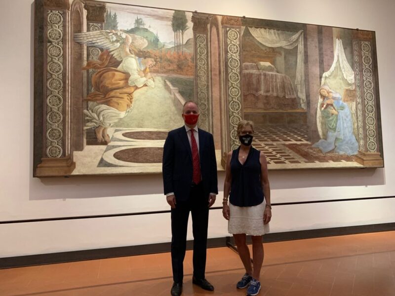 Molto interessata alla dimensione spirituale dell’arte, nel corso della visita si è soffermata molto sulle opere religiose di Botticelli: tra esse, soprattutto la Madonna della Melagrana, la Madonna del Magnificat e l’affresco dell’Annunciazione di San Martino, dove ha scattato la foto di rito con il direttore.