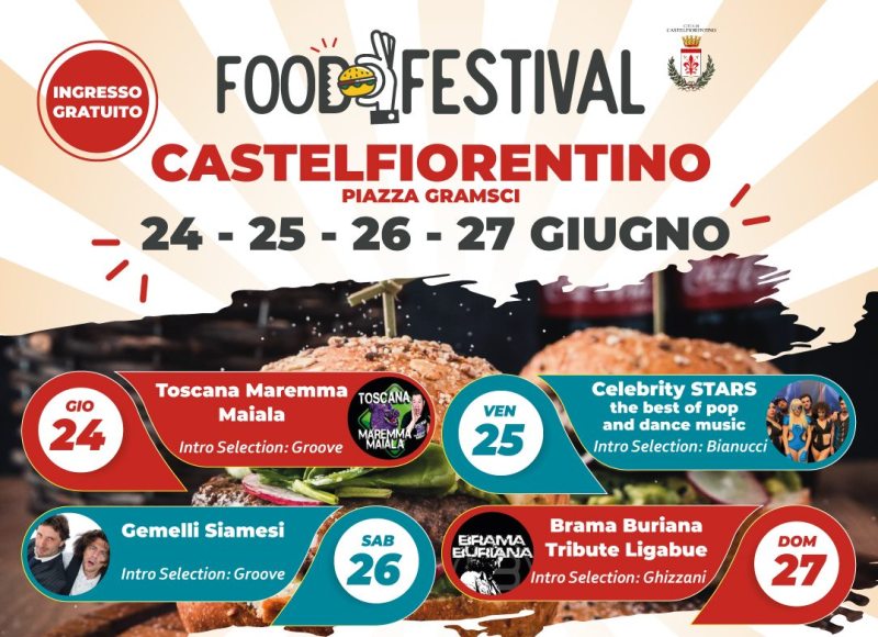Organizzato da Proloco con il patrocinio del Comune di Castelfiorentino, il Food Festival si svolgerà in Piazza Gramsci (dalle ore 18.00 in poi), dove saranno allestiti i vari stand gastronomici e si terranno in serata diversi concerti “live”, tribute band, tutti a ingresso gratuito.
