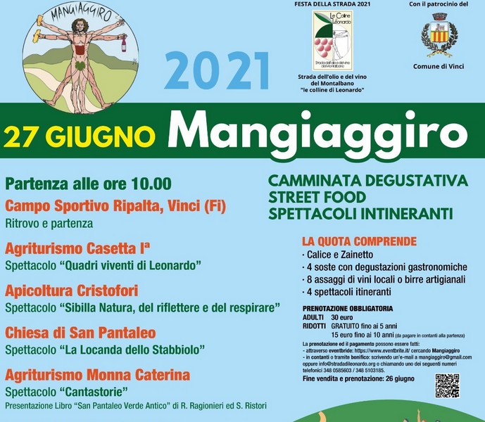 Il percorso di “Mangiaggiro” prevede soste all'agriturismo Casetta 1°, poi presso l'Apicoltura Cristofori, la Chiesa di San Pantaleo, l'agriturismo Monna Caterina, per tornare infine al punto di partenza. Oltre al buon cibo e alle bevande, ad ogni sosta si potrà godere di spettacoli e intrattenimento, messi in scena da Compagnia dell’Unicorno, La Valigia Blu, La Locanda dello Stabbiolo e Ass.Vinci nel Cuore. Gran finale con il concerto degli Arcambold.