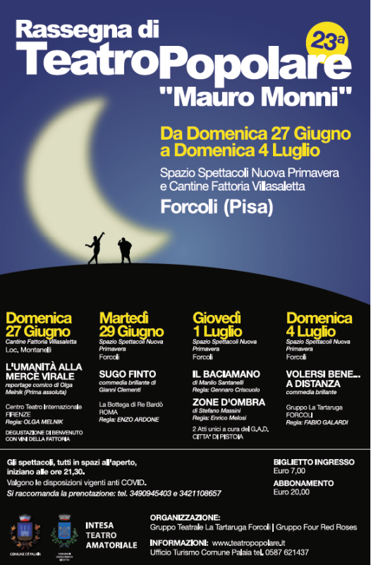 La rassegna proseguirà presso lo Spazio Spettacoli del Centro Nuova Primavera di Forcoli nei giorni di Martedì 29 Giugno con un esilarante “Sugo Finto” portato sulla scena dal gruppo La Bottega di Re Bardò di Roma; Giovedì 1 Luglio in scena il GAD Città di Pistoia, ospite di tutte le edizioni della rassegna, con due atti unici: “Il Baciamano” di Manlio Santanelli e “Zone d’ombra” dell'ormai famoso Stefano Massini. La rassegna si concluderà Domenica 4 Luglio con il gruppo locale La Tartaruga diretto da Fabio Galardi che si cimenta con “Volersi bene...a distanza”, non solo a causa del “Coronavirus”.