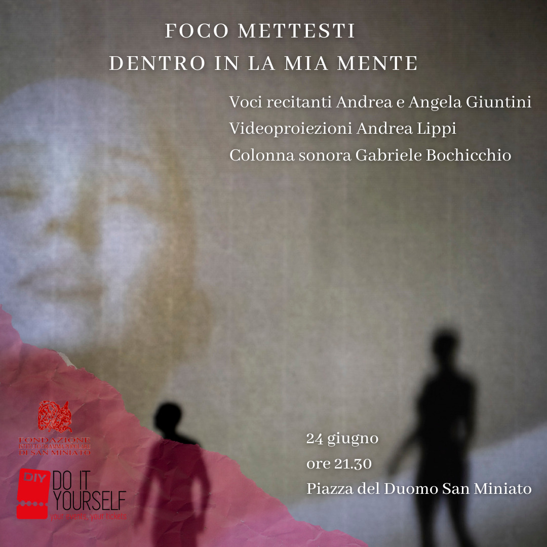 “Foco mettesti dentro in la mia mente” è il verso di Dante preso in prestito dalle sue Rime per il titolo dello spettacolo, nella metafora del fuoco che illumina e riscalda i lettori della sua opera è la chiave della nostra scommessa teatrale nel settimo centenario della sua morte. Invitare una selezionata schiera di personalità della cultura a scrivere liberamente intorno a un aspetto, tra gli innumerevoli, legato al poeta fiorentino. Questo screziato mosaico di spunti, riflessioni e provocazioni andrà a comporre il copione inedito che un attore e un’attrice metteranno in scena nella piazza del duomo di San Miniato, incastonati in un fondale di proiezioni, vegliati dalla torre di Federico e dallo spirito tormentato di Pier Della Vigna, ancora vibrante tra le foglie dei tigli.
