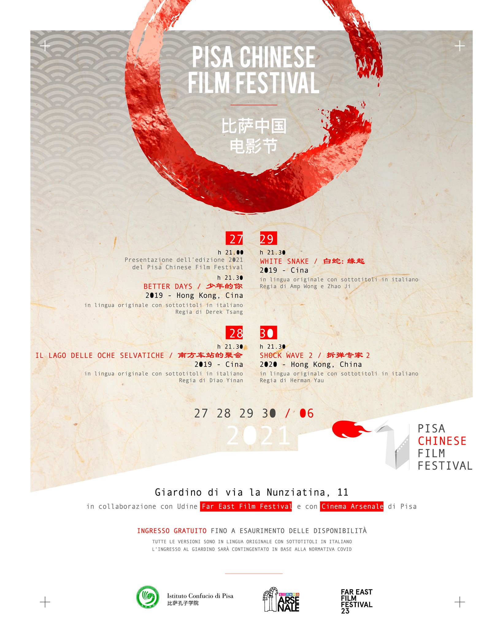 La nuova edizione del Pisa Chinese Film Festival, organizzato dall’Istituto Confucio di Pisa, si presenta all’insegna delle novità. La prima riguarda il luogo e la collocazione temporale. Le proiezioni non si terranno in sala, in concomitanza con i giorni del Capodanno cinese, bensì all’aperto, nel Giardino di via la Nunziatina, a Pisa, nel cuore del giugno pisano. La seconda novità riguarda le nuove collaborazioni grazie alle quali il Festival si presenta in una veste rinnovata per forma e contenuto: l’Udine Far East Film Festival, vera istituzione del cinema asiatico in Italia, e il Cinema Arsenale di Pisa, già partner del progetto, ma che per l’edizione 2021 ha contribuito in maniera importante a conferire un nuovo look al Pisa Chinese Film Festival. Tutti i titoli presenti in cartellone saranno a ingresso gratuito e in lingua originale, con sottotitoli in italiano.