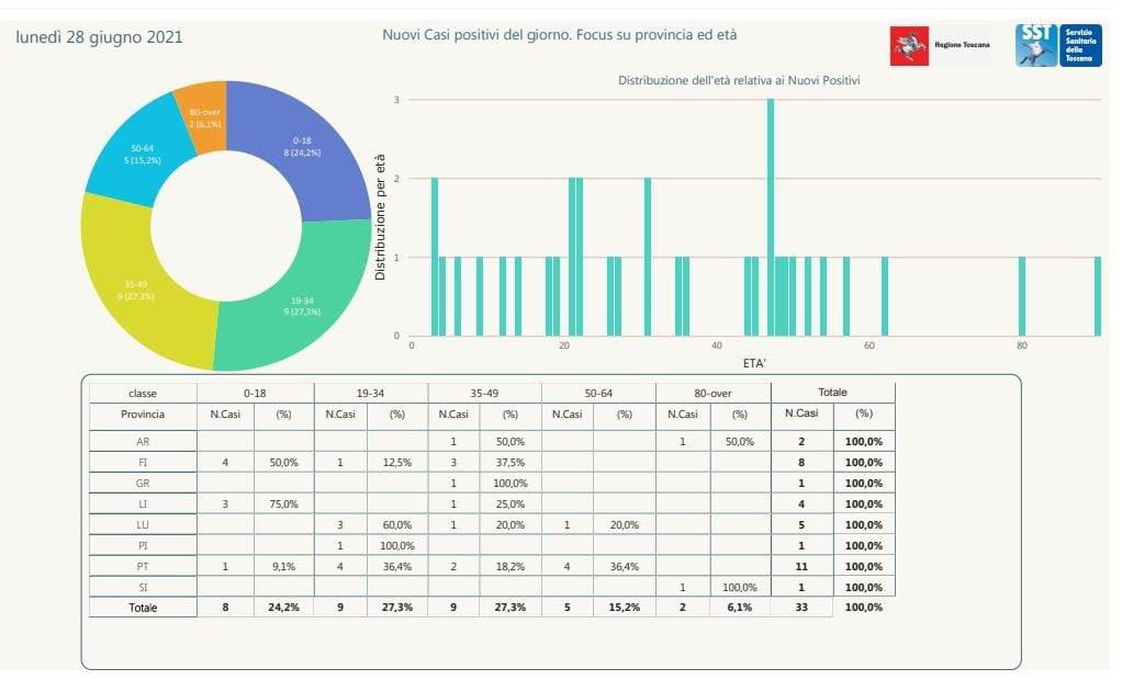 L'età media dei 33 nuovi positivi odierni è di 34 anni circa (27% ha meno di 20 anni, 30% tra 20 e 39 anni, 34% tra 40 e 59 anni, 6% tra 60 e 79 anni, 3% ha 80 anni o più).