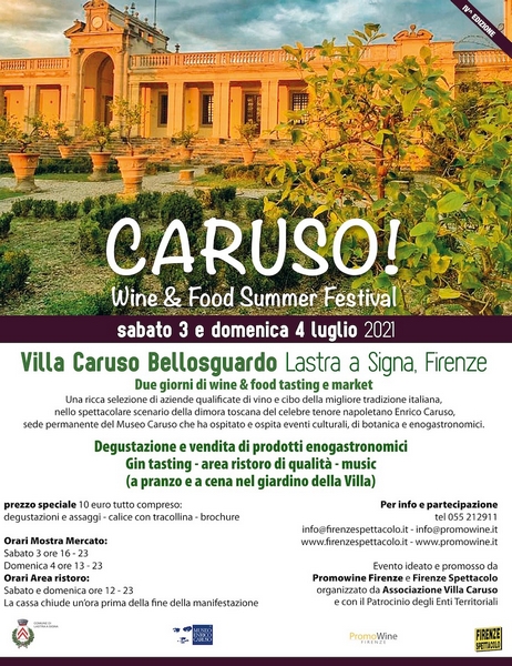 Sarà tutto questo e altro la IV edizione del CARUSO WINE & FOOD SUMMER FESTIVAL, l’appuntamento ideato da Riccardo Chiarini (Vineria Moderna) e Leonardo Tozzi (Firenze Spettacolo) d’intesa con il Museo Caruso e il Patrocinio del Comune di Lastra a Signa, che si svolge sabato 3 e domenica 4 luglio nei saloni e nel parco di Villa Caruso di Bellosguardo a Lastra a Signa. Dalle 18, sia sabato che domenica, anche un D.J. set con Leo Daddi: una suggestiva selezione musicale per rilassarsi nel bel giardino della villa.