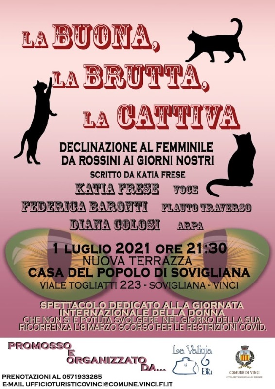 Un recupero di una giornata eccezionale, l'otto marzo, seppure la festa della donna dovrebbe essere tutti i giorni. Bene quindi il recupero al 1 luglio 2021 con la riproposizione di uno spettacolo evento del tutto particolare proposto dall'Associazione Valigia Blù con il patrocinio del Comune di Vinci.