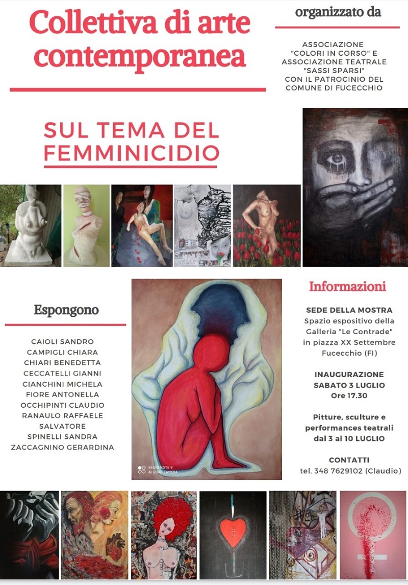 In questi mesi di chiusure e pandemia il tema della violenza sulle donne, ed in particolare del femminicidio, è purtroppo tornato più volte prepotentemente alla ribalta. Proprio per questo, nel momento in cui si cerca di tornare ad una normalità pur rigorosa e attenta, l'associazione Colori in corso ha deciso di realizzare la sua prima mostra post pandemia dedicata proprio al tema del femminicidio. L'esposizione, realizzata in collaborazione con la compagnia teatrale Sassi Sparsi e con il patrocinio del Comune di Fucecchio, sarà inaugurata sabato 3 luglio alle ore 17.30 presso la galleria “Le Contrade” in piazza XX Settembre e sarà visitabile tutti i giorni, dalle ore 17 alle 20, fino al 10 luglio. La mostra presenterà le opere degli artisti dell'associazione Colori in corso ovvero Sandro Caioli, Chiara Campigli, Benedetta Chiari, Gianni Ceccatelli, Michela Cianchini, Antonella Fiore, Claudio Occhipinti, Raffaele Salvatore Ranaulo, Sandra Spinelli, Gerardina Zaccagnino e, proprio grazie alla collaborazione con la compagnia Sassi Sparsi, sono previste anche performance teatrali.