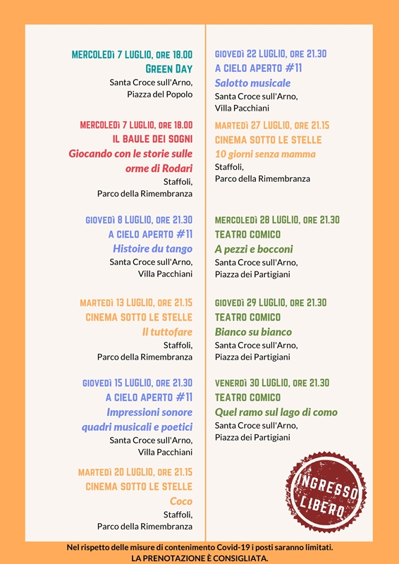 Un calendario ricco di iniziative quello di luglio a Santa Croce sull’Arno. Il Comune, insieme ad associazioni e realtà che operano nel settore dello spettacolo, promuove per tutto il mese iniziative per tutta la cittadinanza.