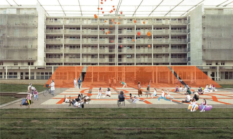 “Abbiamo bisogno di città che saranno condizioni per la vita, per vite piene e libere e non frammentate, non città di separazione e dominazione, abbiamo bisogno di muri che accolgano e proteggano, non muri che escludano e opprimano”: inizia, con questa citazione, la relazione del progetto vincitore ‘From architecture into art’. E’ stata fatta questa scelta perché - attraverso un gesto unico, semplice e economico - si tenta di conferire varie funzioni a piazza Dallapiccola, creando così una nuova copertura addossata al portico esistente. Proprio la copertura sarà l’unico elemento architettonico presente. Il ‘muro’ permeabile offre la possibilità di suddividere la piazza in due aree differenti: quella sotto al portico, già dotata di sedute (le gradinate esistenti) e quella dell’effettivo spazio della piazza, diventando il fondale di un ipotetico teatro all’aperto che potrà ospitare gli eventi più importanti. Durante i grandi eventi i cittadini potranno portare le proprie sedie da casa, come avveniva nei tempi passati per partecipare ai cinema all’aperto.