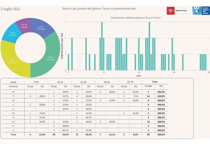 L'età media dei 58 nuovi positivi odierni è di 36 anni circa (24% ha meno di 20 anni, 28% tra 20 e 39 anni, 38% tra 40 e 59 anni, 10% tra 60 e 79 anni, 0% ha 80 anni o più).