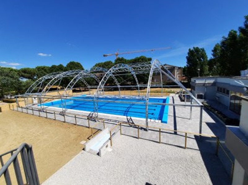 Ricordiamo alcuni dettagli tecnici del progetto: la tensostruttura che coprirà la vasca è di circa 570 metri quadrati di superficie, con altezza tra i 2,50 metri nei lati e 7 metri del colmo e poggerà su 5 archi in acciaio reticolari (in questo momento già montati). Inoltre i lavori hanno interessato gli impianti di filtraggio e sanificazione, totalmente rinnovati, e la zona degli spogliatoi con docce, servizi igienici adeguati per l’utilizzo da parte di utenti disabili e in coerenza con la normativa regionale e del Coni. L’importo generale del progetto ammonta a circa 998.400 euro, l’opera è stata totalmente finanziata con risorse comunali.
