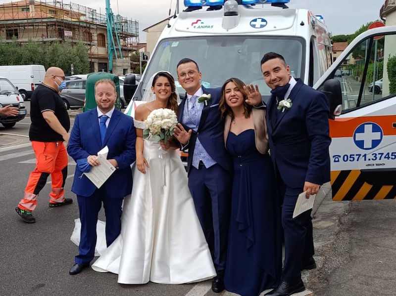 Andrea Parenti, 37 anni, è magazziniere e volontario. Martina Genova, 28 anni, è studentessa e anche lei volontaria. Il matrimonio si è tenuto alla chiesa di Santa Maria a Spicchio, Vinci. E alla celebrazione non poteva mancare la Pubblica Assistenza.