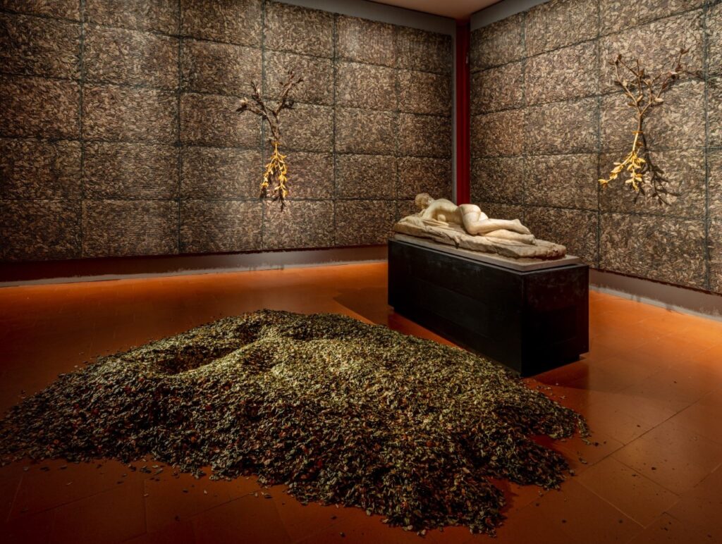 Ancora il tema dell'epidermide offre l’occasione di mettere l’opera di Penone in dialogo due statue dell’antichità romana che si trovano all’inizio del corridoio di Ponente degli Uffizi, raffiguranti ciascuna Marsia scorticato: privato della pelle il corpo perde ogni confine, mentre la pelle svuotata del corpo diventa spazio virtuale. Vicino ad esse l'artista ha voluto collocare Pensieri di foglie (2014) dove, con allusione alla somiglianza tra esseri umani e mondo vegetale, un'immagine antropomorfa è coperta da un abito di foglie che la avvolge come un manto. Si veste di un abito mitologico anche la grande scultura in bronzo intitolata Artemide (2019): un doppio calco di un albero che mostra insieme l'interno e l'esterno, il vuoto e il pieno, con protuberanze simili a mammelle, come nell’Artemide di Efeso, cui in effetti fa riferimento il titolo. Con l'installazione Respirare l'ombra (2000) Penone racconta lo spazio che attraverso il respiro riempie e plasma il nostro corpo e che è oggetto di un continuo scambio con l'ambiente esterno. Alla complementarietà tra fotosintesi delle piante e respirazione umana rimanda infatti il polmone di foglie in bronzo dorato posto tra le gabbie che rivestono le pareti, ad un’altezza pari a quella del polmone umano. Un'altra metafora poetica si riconosce in Soffio di foglie (1979) dove al negativo dell'impronta del corpo e alla traccia lasciata dal respiro dell'artista su un cumulo di foglie di bosso fa eco, al centro della sala, il positivo del corpo dell'Ermafrodito adagiato supino su un cuscino, simbolo della compresenza degli opposti.