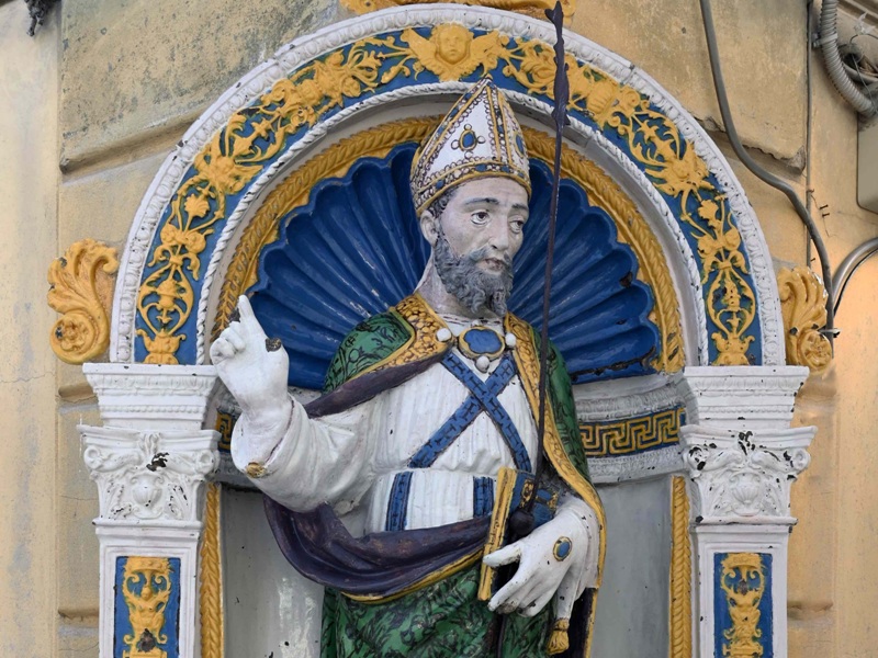 La terracotta invetriata realizzata intorno al 1525 da Giovanni della Robbia, rappresenta un punto di riferimento per la comunità del quartiere. Posto all’angolo dell’edificio tra via De’ Macci e borgo la Croce esso guarda a Piazza S. Ambrogio e dunque a uno dei fulcri della zona. L’opera è costituita da un’edicola centinata sulla quale si trova la statua di Sant’Ambrogio all’interno di una nicchia, affiancata da lesene con capitelli compositi che sostengono un arco a tutto sesto. Il santo è rappresentato barbato con gli abiti vescovili in atto benedicente, mentre con la mano sinistra regge il libro e un pastorale che oggi è stato sostituito da una semplice asta metallica. Sant’Ambrogio indossa, oltre alla mitra e ai guanti bianchi gemmati, una dalmatica bianca sulla quale spicca una stola incrociata di colore blu, coperta in parte da un piviale verde con bordure dorate, finemente decorato. L’opera fu commissionata dalla Città Rossa del rione di Sant’Ambrogio, una delle Potenze festeggianti della città, espressione del popolo minuto cui era demandata l’organizzazione di feste, spettacoli, armeggiamenti nel rione e che si occupava di sostenere le istituzioni laiche e religiose del quartiere.