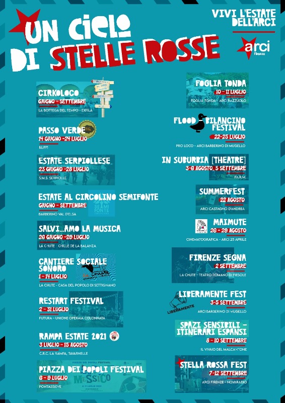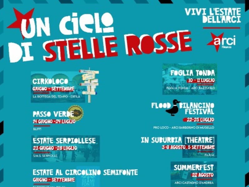 Sarà un’estate nel segno della cultura e dell’arte quella che l’Arci di Firenze ha deciso di promuovere attraverso i propri Circoli, Associazioni e Case del Popolo. 18 festival su tutto il territorio della provincia fiorentina che vanno a comporre il “Cielo di Stelle Rosse”, le stelle dell’arci che nonostante i tanti mesi di chiusura forzata a causa del covid provano a ripartire grazie alla volontà e la creatività dei suoi volontari.