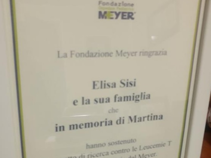 Una raccolta fondi online e una cena benefica: sono questi gli strumenti attraverso cui Elisa Sisi, una mamma coraggiosa, ha raccolto fondi da destinare alla Fondazione Meyer per sostenere “In memoria di Martina”, un progetto di ricerca del Laboratorio di Oncoematologia pediatrica dell’Ospedale pediatrico fiorentino. Il fine era conoscere meglio la leucemia linfoblastica acuta di tipo T ed esplorare nuove possibilità terapeutiche. Elisa Sisi ha dichiarato guerra a questa malattia che due anni fa ha portato via sua figlia Martina, una bambina dal sorriso dolcissimo. L'11 giugno si è tenuta una serata dedicata a questo obiettivo, a Cerreto Guidi. Elisa Sisi con una lettera ha voluto ringraziare chi ha partecipato.