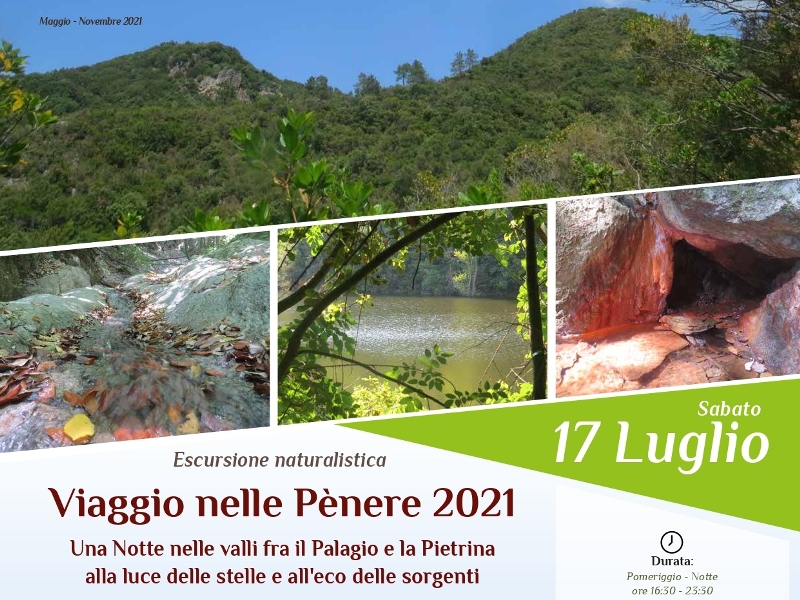 Dalla località Il Palagio, i partecipanti, accompagnati dalla guida Ambientale Escursionistica (ai sensi della LR 86/2016), si incammineranno nel tardo pomeriggio fra i boschi della Pènera Bianca e della Pènera Rossa alla volta del Santuario della Pietrina, percorrendo un sentiero di circa 8 km. Raggiunto il Santuario, dedicato ai Santi Andrea e Agata, potranno esplorare i ruderi dell'antico castello della Pietrina ricordato per la prima volta in un documento del 1118.