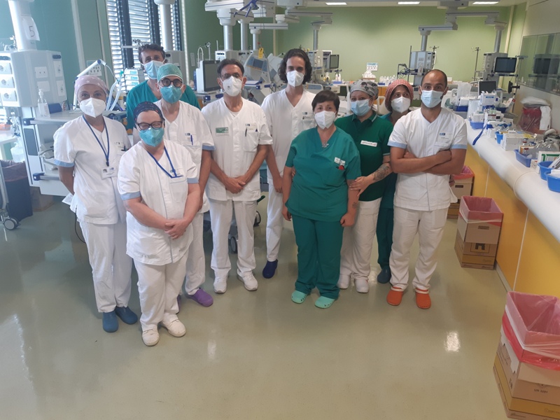 Durante la prima ondata della pandemia i posti letto di terapia intensiva furono aumentati da 10 a 21 trasformando 3 sale operatorie in terapia intensiva e successivamente rimodulando tutta la terapia subintensiva in terapia Covid. Questa situazione è stata sostenuta grazie all’impegno profuso dagli anestesisti e dai cardiologi, da tutto il personale infermieristico e Oss della terapia subintensiva e del blocco operatorio e dell’Emodinamica, coordinati da Michele Trinci, Tania Fioravanti e Marco Centini. Da ottobre 2020 con la seconda e la terza ondata, è stato necessario modificare 6 sale operatorie in modo da accogliere 13 pazienti e i posti letto di terapia intensiva Covid sono diventati 23 garantendo contemporaneamente l’assistenza anche per le persone che necessitavano di terapia intensiva no-Covid.