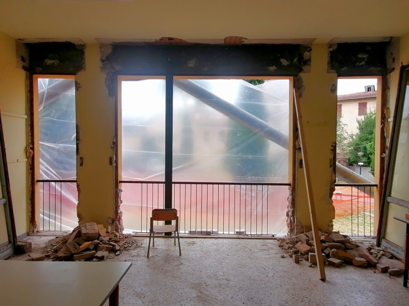 Il cantiere sta procedendo secondo i ritmi stabiliti e proseguirà senza interruzioni per tutta l’estate in modo da non interferire con il calendario scolastico. Attualmente sono stati modificati i profili di alcune finestre al fine di garantire adeguata illuminazione agli spazi e sono in corso le procedure di rimozione degli infissi esistenti in legno, mentre la prima tranche di fornitura dei nuovi infissi è prevista entro la fine di luglio.