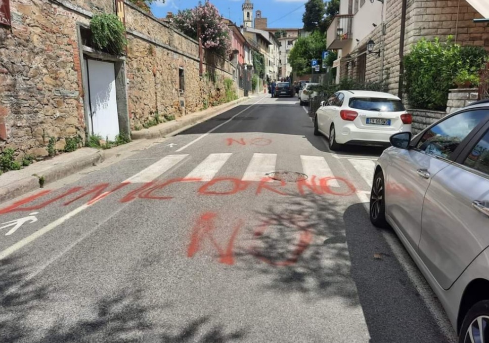 "No, unicorno no". Una scritta in rosso sull'asfalto è apparsa in centro a Vinci oggi, domenica 18 luglio. Si tratta di una frase vergata con lo spray arancione e considerata un grido di protesta contro la Festa dell'Unicorno, rassegna fantasy che si tiene a Vinci ogni estate.