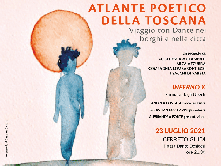 Al centro della serata il Canto X dell’Inferno dove Dante incontra Farinata degli Uberti. I protagonisti della serata sono Andrea Costagli (voce recitante), Sebastian Maccarini (pianoforte) e Alessandra Forte (presentazione). L’attore interpreterà il Canto e si inoltrerà nel personaggio che lo caratterizza. Nello stesso tempo verrà effettuata una breve spiegazione del Canto che aprirà la serata.