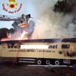 Il mezzo incendiato trasportava materiale ligneo e le fiamme, alte circa 6 metri, hanno interessato alcuni pini che si trovavano nelle immediate vicinanze. Le operazioni di spegnimento sono ancora in corso e non si registrano danni a persone né problematiche alla viabilità.