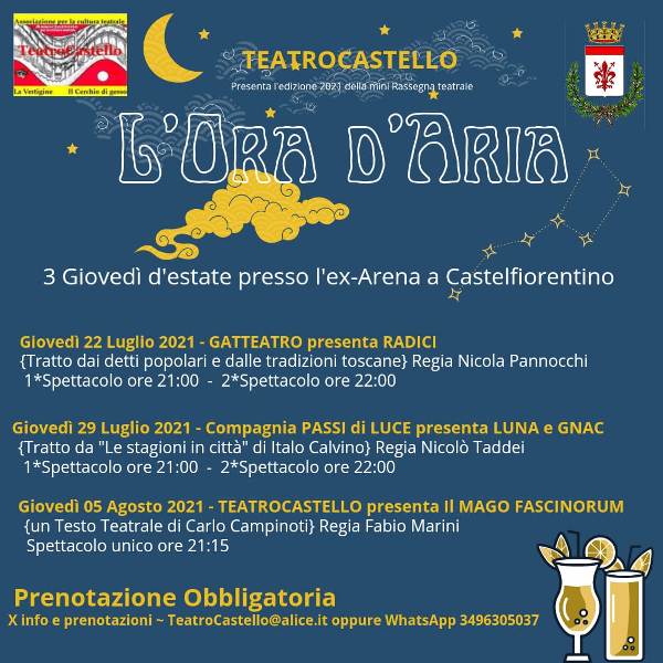 La Rassegna “L’Ora d’Aria” è promossa da TeatroCastello e gode del patrocinio del Comune di Castelfiorentino.