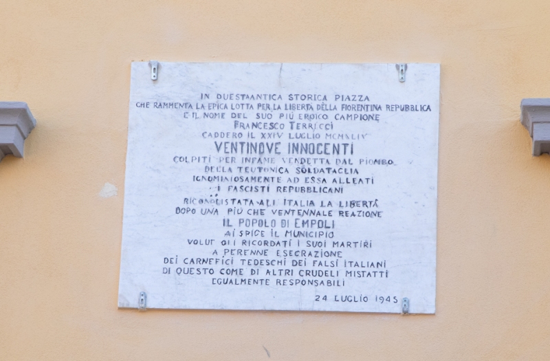 Questa mattina, sabato 24 luglio 2021, si è tenuta la commemorazione del settantasettesimo anniversario dell’eccidio del 24 luglio 1944, avvenuto a pochi passi da piazza Farinata degli Uberti e dal centro, in quella che si chiamava Piazza Ferrucci, la piazza del mercato. Ventinove cittadini empolesi furono fucilati per rappresaglia da mani naziste. Un evento che porta ancora il peso del grande dolore che segnò la storia di questa città.