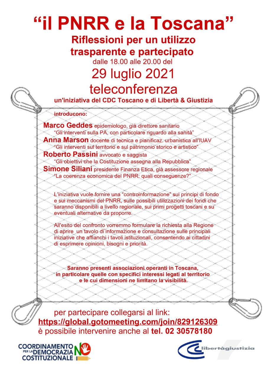 Il Coordinamento per la Democrazia Costituzionale toscano e l’associazione Libertà&Giustizia si sono fatti promotori di un incontro pubblico ‘on line’ per parlarne con alcuni esperti. All’incontro parteciperanno numerose associazioni operanti nella nostra regione su vari argomenti, interessate a valutare i progetti che saranno finanziati e la loro coerenza con le effettive esigenze di un territorio che sta pesantemente pagando le conseguenze della pandemia, ma era già in difficoltà anche prima che essa scoppiasse. Oltre a brevi interventi delle associazioni stesse, sono previste relazioni dell’urbanista Anna Marson e del presidente di Finanza Etica Simone Siliani, entrambi già assessori regionali, dell’epidemiologo Marco Geddes e dell’avvocato e saggista Roberto Passini