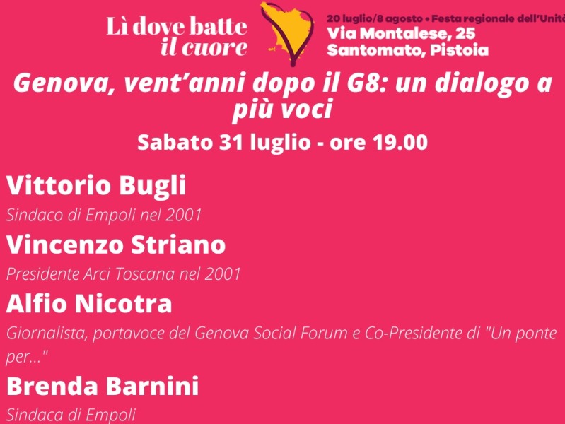 Si proverà a capire cosa è rimasto di quei giorni a Genova nell’incontro “Genova, vent’anni dopo il G8. Un dialogo a più voci” a cui prenderanno parte Alfio Nicotra, giornalista, co-presidente di "Un ponte per..." e portavoce del Genoa social forum; Vincenzo Striano, presidente Arci Toscana nel 2001; Vittorio Bugli, sindaco di Empoli nel 2001 e presente a Genova nei giorni del G8 in veste istituzionale, Antonio Vermigli, responsabile della Rete Radié Resch di Quarrata. Direttore della rivista “In dialogo”, Bernardo Marasco, segreteria Cgil Firenze e Brenda Barnini, sindaca di Empoli e responsabile Welfare Partito democratico.