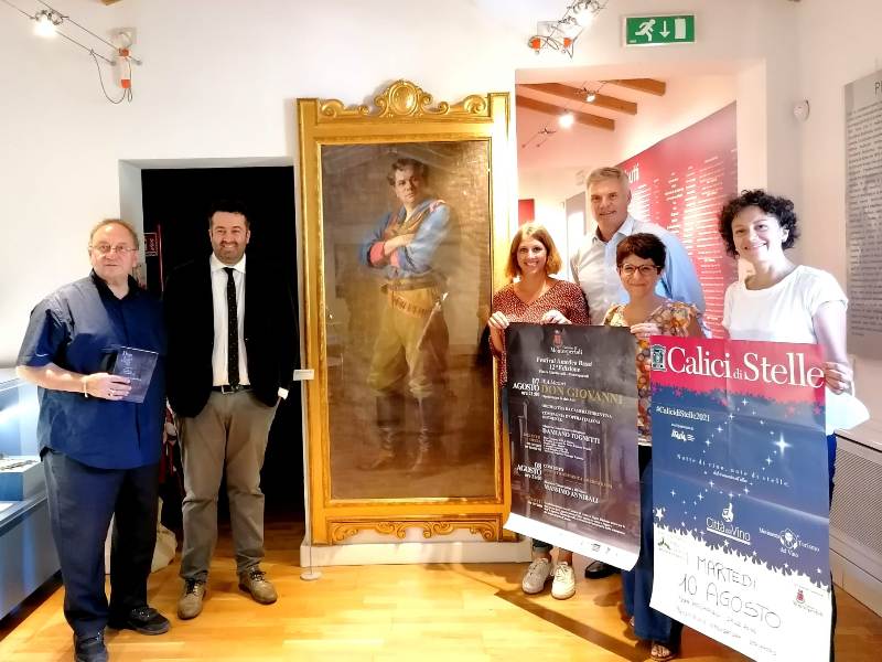 Presenti alla conferenza stampa il Sindaco Mugnaini con l'Assessora alla cultura Alessandra De Toffoli, il Direttore Artistico Giuseppe Lanzetta e il regista Franz Moser, per l'Accademia Musicale "Amedeo Bassi" Melania Minacci e per Calici di stelle la Presidentessa della Pro Loco Benedetta Rigacci.