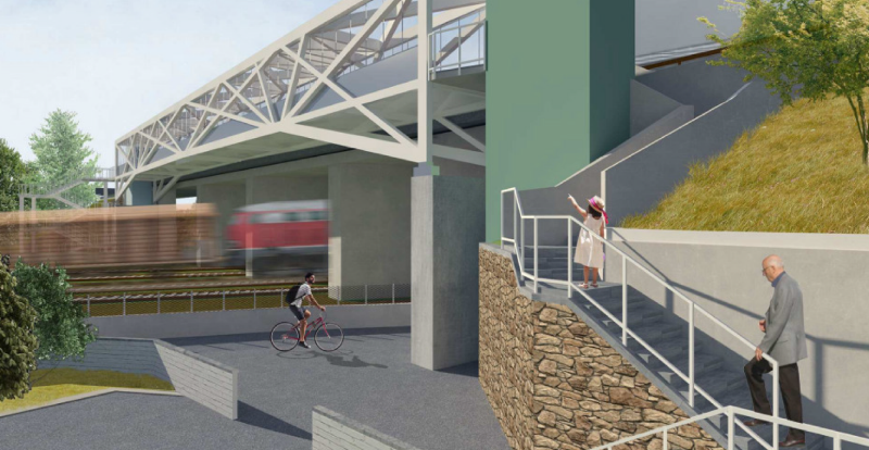 La passerella, costituita in profilati tubolari in acciaio, sarà aperta nella parte superiore e chiusa lateralmente mediante pannelli di lamiera con la finalità di proteggere la sede ferroviaria dalla caduta di oggetti. La pavimentazione della passerella sarà in conglomerato drenante, ecocompatibile, incombustibile e antisdrucciolo. I vani ascensore saranno realizzati in cemento armato a faccia vista, con pensilina leggera di protezione agli ingressi. La scala di accesso sud sarà realizzata mediante profilati in acciaio zincati. La scala nord sarà in parte su terra, in parte a soletta rampante, sarà rivestita in lastre di pietra. In corrispondenza dell’accesso nord, sotto la scala, è previsto un vano parzialmente aperto per l’alloggio dei quadri elettrici e ascensore, dotato di un soppalco in acciaio e lamiera per l’accesso alla manutenzione dei tiranti. E’ prevista inoltre una illuminazione del percorso ciclopedonale, sia dell’interno che dall’esterno.