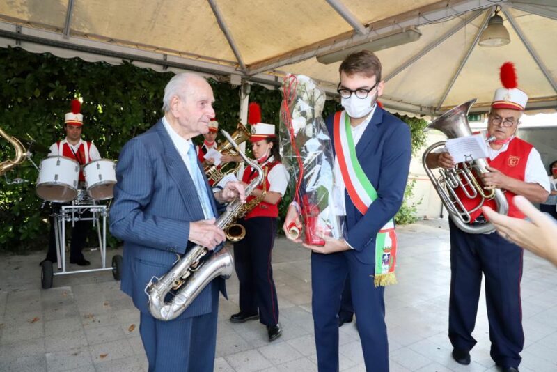 I cento anni di Ottorino Mancini sono stati festeggiati domenica 1 agosto 2021, alla ‘Sala 78’ del circolo Arci di Ponte a Elsa, accompagnate dalle note della Filarmonica della Scala di cui ha fatto parte da giovane. Con lui familiari, amici, amiche, nipoti e bisnipoti. In rappresentanza dell’amministrazione comunale Alessio Mantellassi, presidente del Consiglio Comunale che gli ha portato una pergamena come riconoscimento di questo bel traguardo e un omaggio floreale.