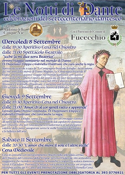 La Compagnia il Giglio, torna a Fucecchio, per un omaggio classico all’opera del Sommo Poeta. Musica e parole dal capolavoro dantesco nel Chiostro che per l’occasione si trasformerà in un elegante salotto, dove poter assaporare sotto le stelle l’essenza del poema e la bellezza dell’arte. GIOVEDI dalle ore 19.30 – EVENTO CON PRENOTAZIONE 3930776921