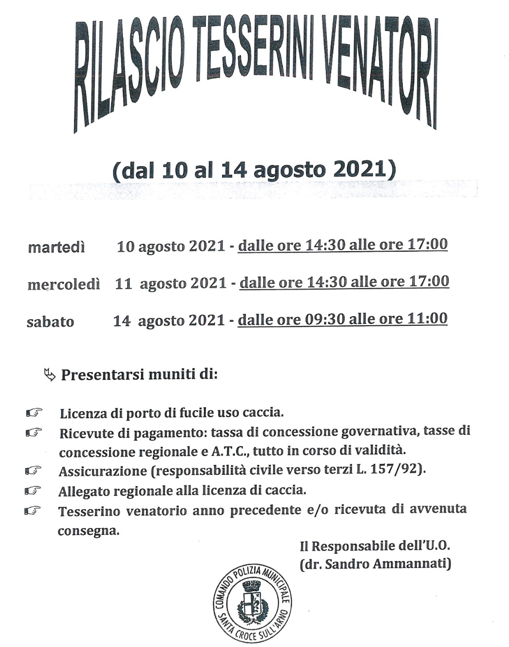 Di seguito il calendario della prossima settimana e le modalità per il ritiro dei tesserini venatori (stagione 2021/2022) presso il comando di Polizia Municipale di Santa Croce sull'Arno.