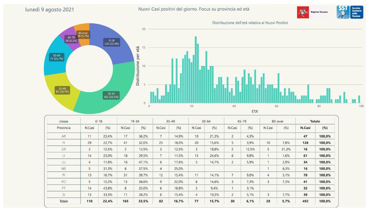 L'età media dei 492 nuovi positivi odierni è di 36 anni circa (26% ha meno di 20 anni, 35% tra 20 e 39 anni, 23% tra 40 e 59 anni, 10% tra 60 e 79 anni, 6% ha 80 anni o più).