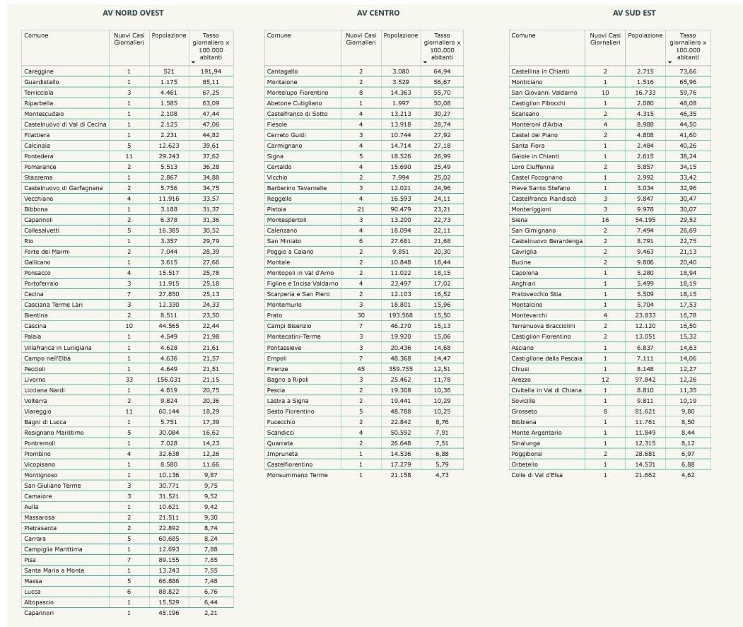 La Toscana si trova al 12° posto in Italia come numerosità di casi (comprensivi di residenti e non residenti), con circa 7.022 casi per 100.000 abitanti (media italiana circa 7.419 x100.000, dato di ieri). Le province di notifica con il tasso più alto sono Prato con 9.226 casi x100.000 abitanti, Pistoia con 8.268, Pisa con 7.365, la più bassa Grosseto con 4.474.