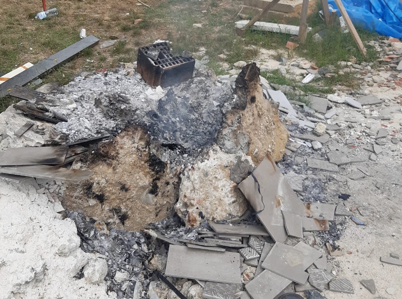 I fumi risultanti dall’abbruciamento erano di odore acre, tipico della combustione di plastiche. Il sito in cui era stato acceso il focolaio era stato appositamente predisposto e si notavano resti di frammenti di materiale plastico e di cartone. All’interno dell’area di cantiere recintata, si individuava un punto di abbruciamento dove in passato presumibilmente erano stato bruciati dei pancali in legno.