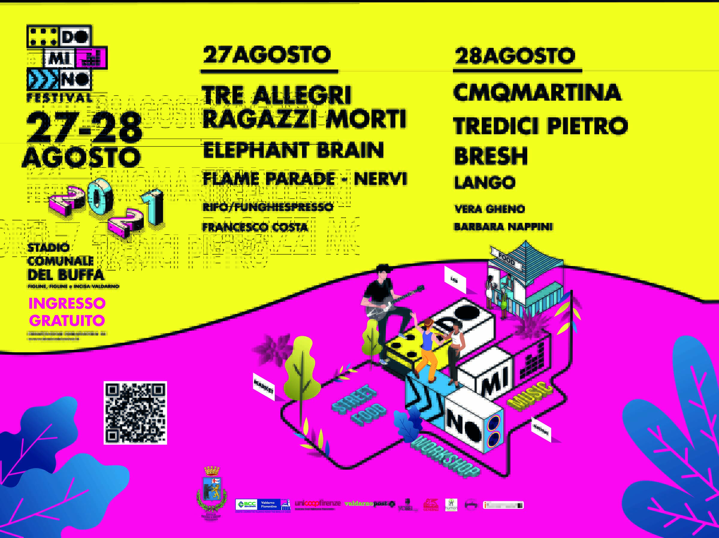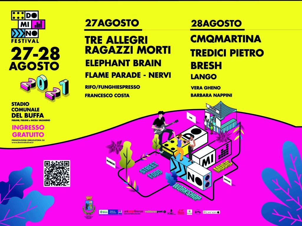 Ci sono alcuni dei maggiori talenti under 25 della musica italiana. C’è la cultura, con ospiti capaci di offrire nuovi sguardi sul contemporaneo. Ci sono laboratori sul riuso, sul benessere, sulla sostenibilità. È la formula di Domino Festival, prima edizione della rassegna in programma il 27 e 28 agosto allo stadio comunale Goffredo Del Buffa di Figline, una due giorni dedicata alle nuove generazioni e al cambiamento che avrà come protagoniste voci nuove ed emergenti dal mondo della cultura, dell’arte, dell’impresa e dell’attivismo ambientale. Il festival è il risultato di un percorso di co-progettazione promosso dal Comune di Figline e Incisa Valdarno per lo sviluppo e l’attivazione del tessuto sociale giovanile, organizzato dal Comune in partenariato con l’associazione Acustica, vincitrice del bando pubblico. Sul palco tre dei giovani artisti italiani di maggior successo: CmqMartina, Tredici Pietro e Bresh, oltre a una band che rappresenta la storia del rock indipendente nostrano come i Tre Allegri Ragazzi Morti, un’ampia rassegna di musicisti emergenti, e, in veste di ospiti culturali, il giornalista Francesco Costa, la sociolinguista Vera Gheno e la presidente di Slow Food Italia Barbara Nappini. A completare il tutto, un ampio mercatino di dischi, artigianato e abbigliamento e street food per tutti i gusti. Gli eventi di Domino Festival, che segnerà anche il ritorno dei grandi concerti all’aperto in Valdarno dopo la lunga sospensione per l’emergenza sanitaria, sono a ingresso gratuito. Obbligatori la prenotazione e il Green pass.